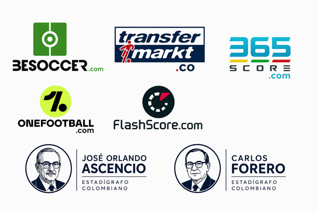 Fuentes de investigación: BeSoccer.com, Trasnfermarkt.co, 365score.com, OneFotball.com, FlashScore.com, y los estadigrafos colombianos José Orlando Ascencio y Carlos Forero.