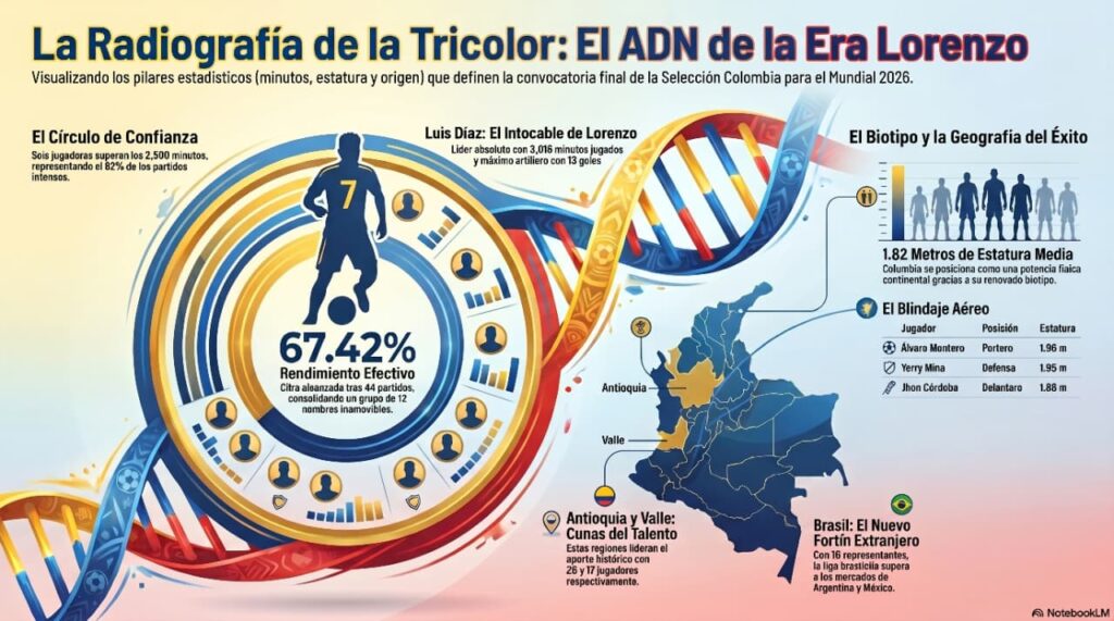 Antioquia (26 jugadores) y el Valle del Cauca (17) lideran el aporte histórico en el ciclo, seguidos de cerca por el Cauca (10) y el Chocó (9). Es la “fibra del Pacífico” la que otorga esa potencia física que hoy admiramos.
